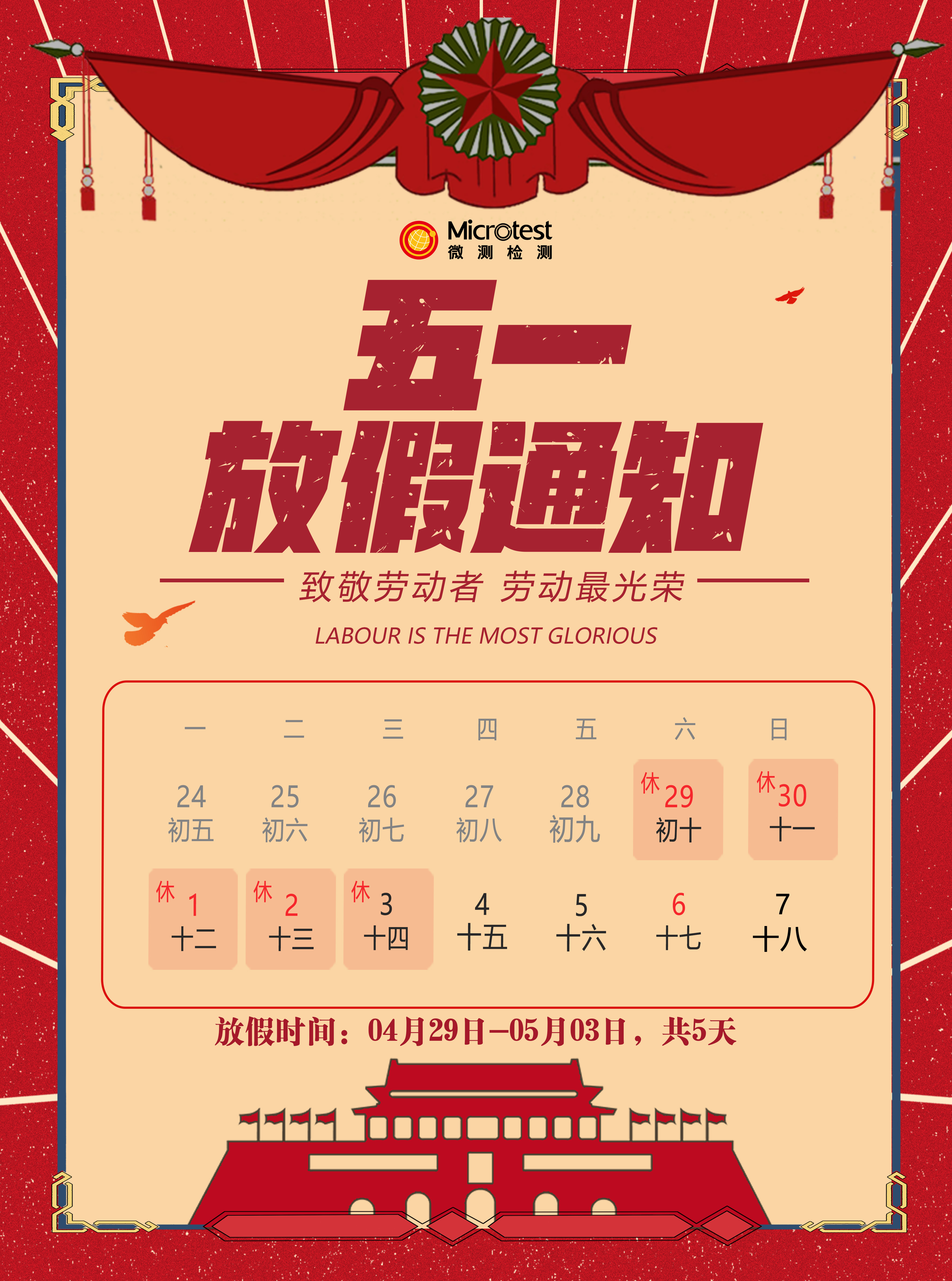 1、勞動節放假時間:4月29日(星期六)至5月3日(星期三)放假,共5天。