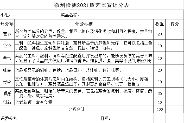 評委們依照比賽評分表進行打分,決出前三名,廚神隊伍將獲得1000元現金大獎,二三名隊伍將獲得一套廚師服。