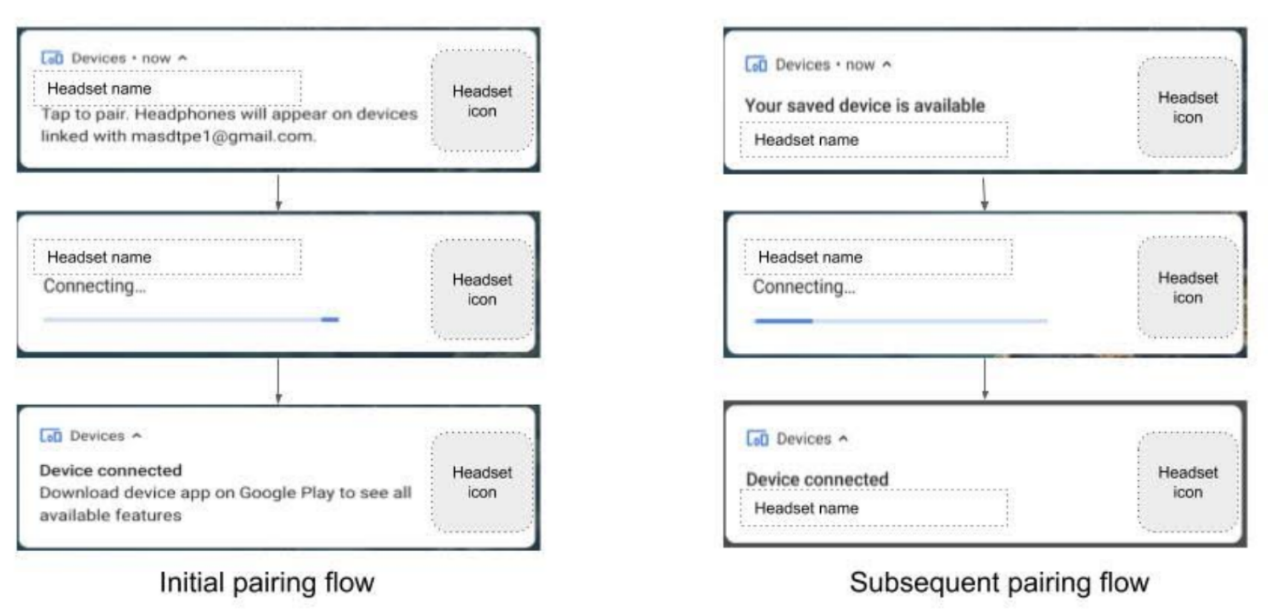 Subsequent pairing: 后續配對是該設備與登錄了相同Google帳戶的其他手機之間的二次配對,并且該手機會檢測到廣告并從該設備識別出Model ID。然后用戶按照彈出通知中顯示的說明連接設備