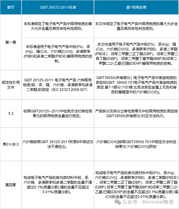 新標準除了更新中國RoHS限制物質以外,檢測方法也由GB/T 26125變更為GB/T 39560系列方法,此外還對原標準規范性引用文件名及部分腳注也作了修改  ,修改單將于2026年1月1日正式實施