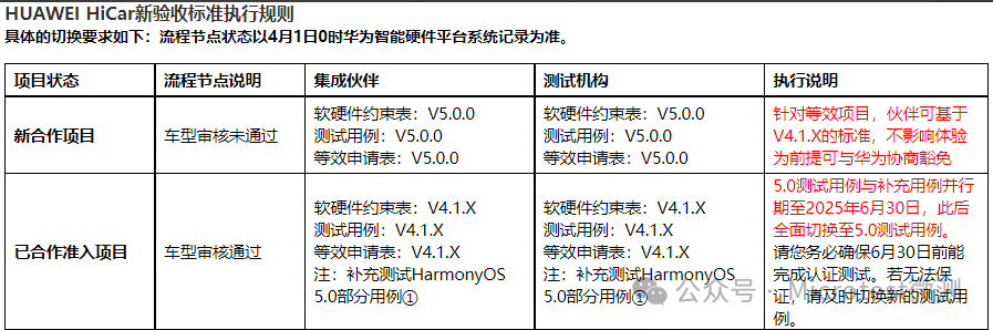 前言:為持續提升HUAWEI HiCar與車載設備的兼容性及用戶體驗,華為技術有限公司基于行業發展趨勢與技術迭代需求,正式發布《HUAWEI HiCar汽車接入驗收標準(V5.0.0)》。此次標準升級圍繞測試設備要求、文檔體系及測試用例三大維度展開全面優化,旨在為合作伙伴提供更高效、更精準的技術對接指引。