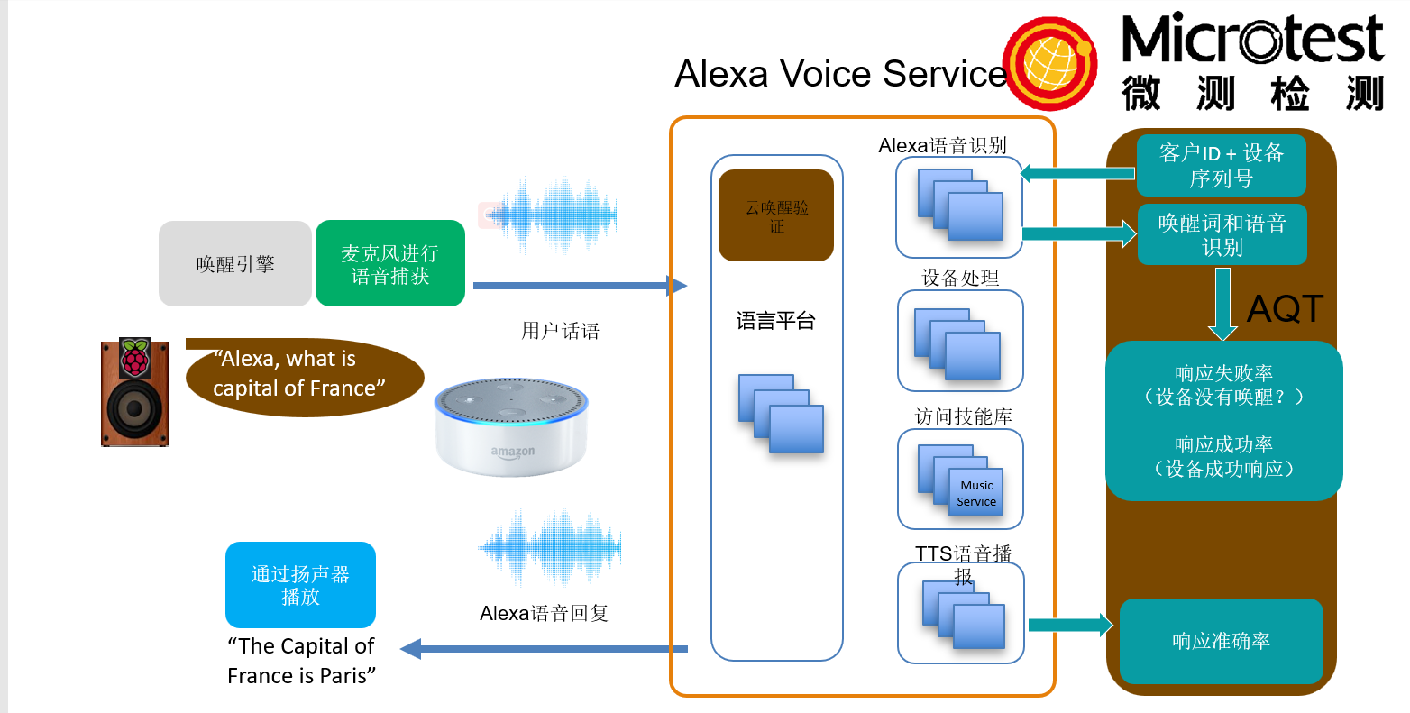 微測檢測根據亞馬遜規范搭建了完善的Alexa測試系統,對產品正常使用時的響應失敗率,響應準確率,誤喚醒率能做到精準統計,使產品達到亞馬遜規范的要求,協助產品通過認證。